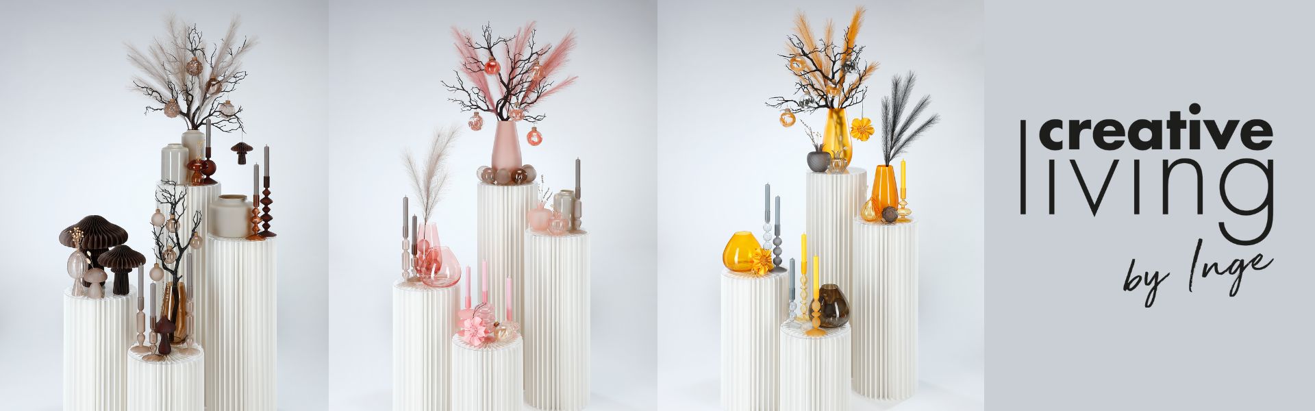Mit creative living by Inge stellen wir Ihnen eine Kollektion für das ganze Jahr vor. Elegante Farbkompositionen für eine stilvolle Dekoration zu Hause. Zartes Glas mit exklusivem Eco-Aufhänger (gesetzlich geschützt), Pampasgras, Zweige und feine Vasen geben Raum für ein individuelles Farbspiel in jeder Jahreszeit!