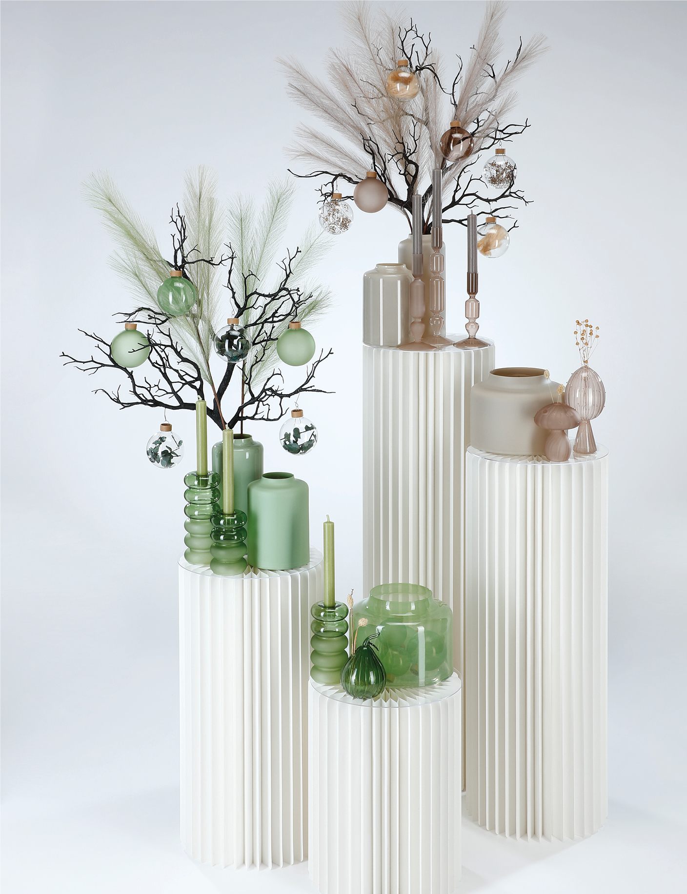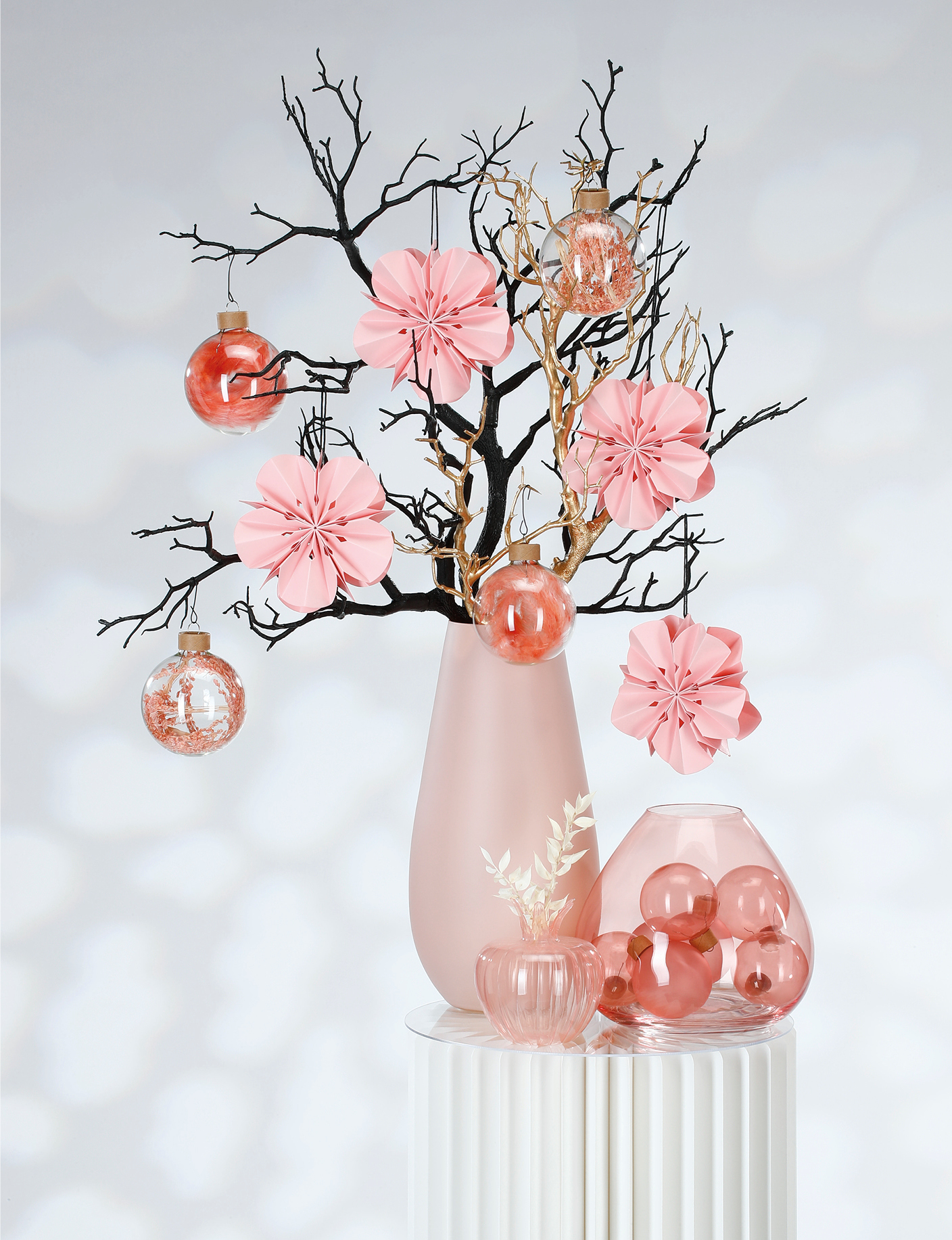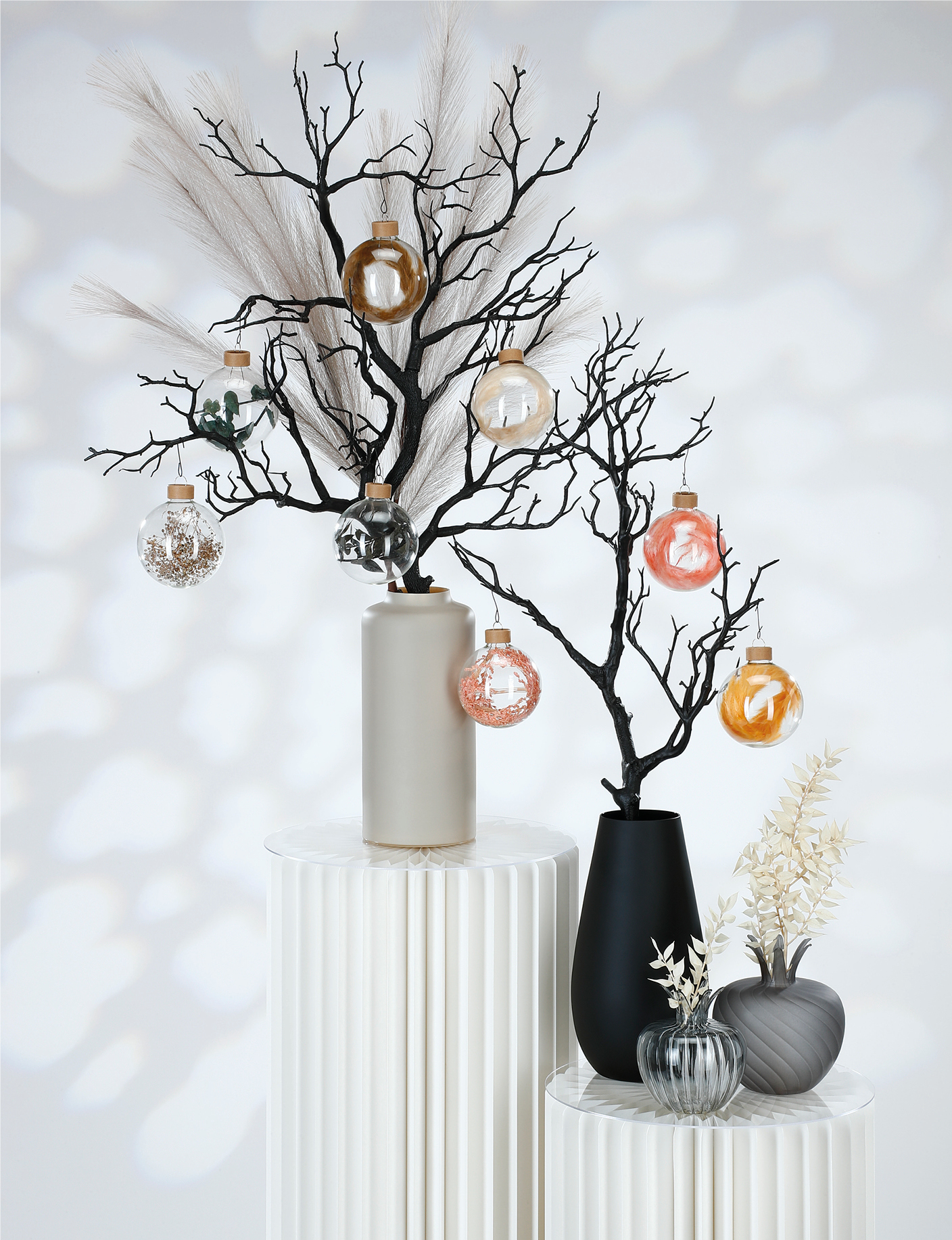 Elegante Farbkompositionen für das ganze Jahr lassen Ihnen den Raum für ein individuelles Farbspiel. Aus zartem Glas mit exklusivem Eco-Aufhänger (gesetzlich geschützt), Pampasgras, Zweigen und feinen Vasen gestalten Ihre Kunden mit wenigen Handgriffen eine stilvolle Dekoration für ihr Zuhause.