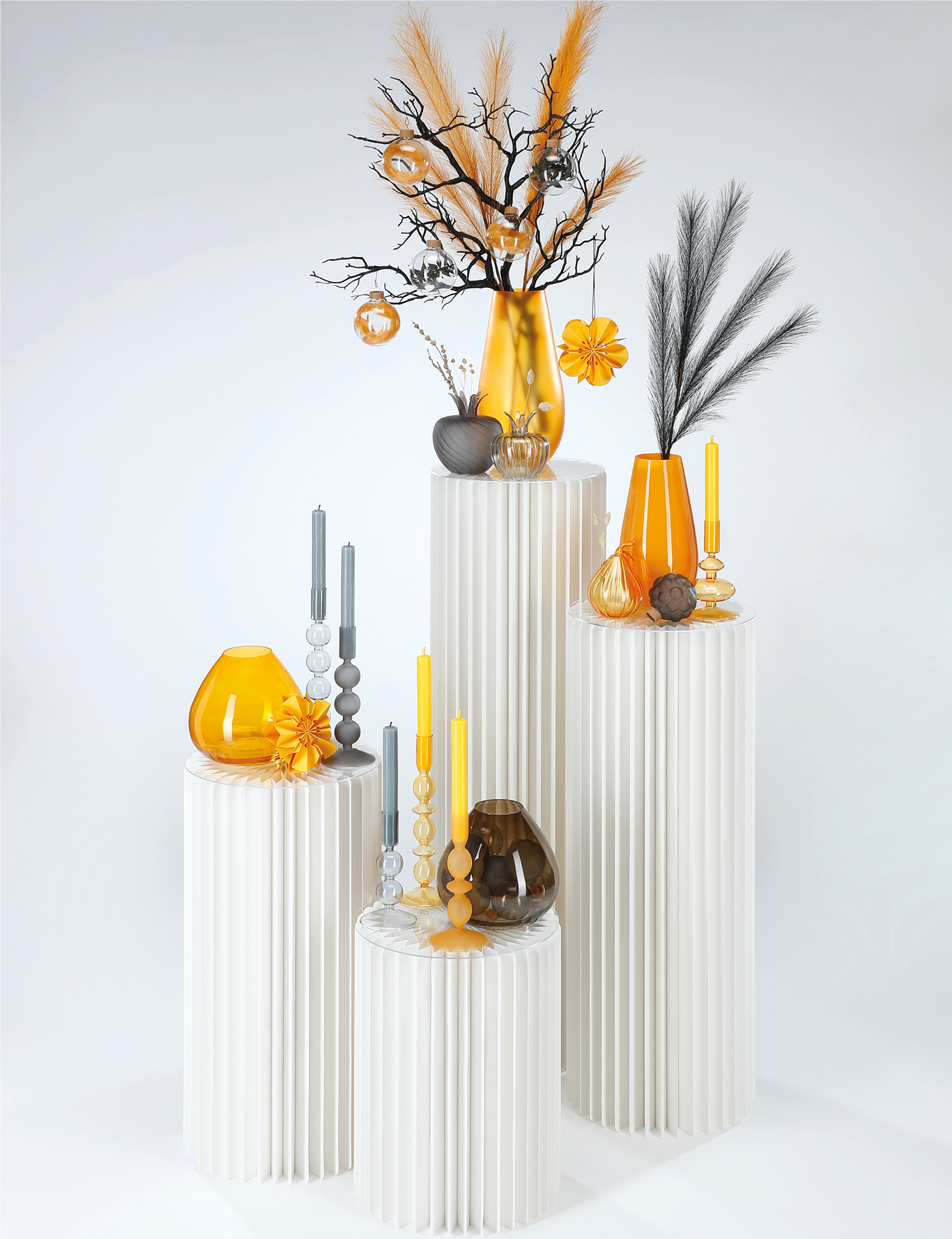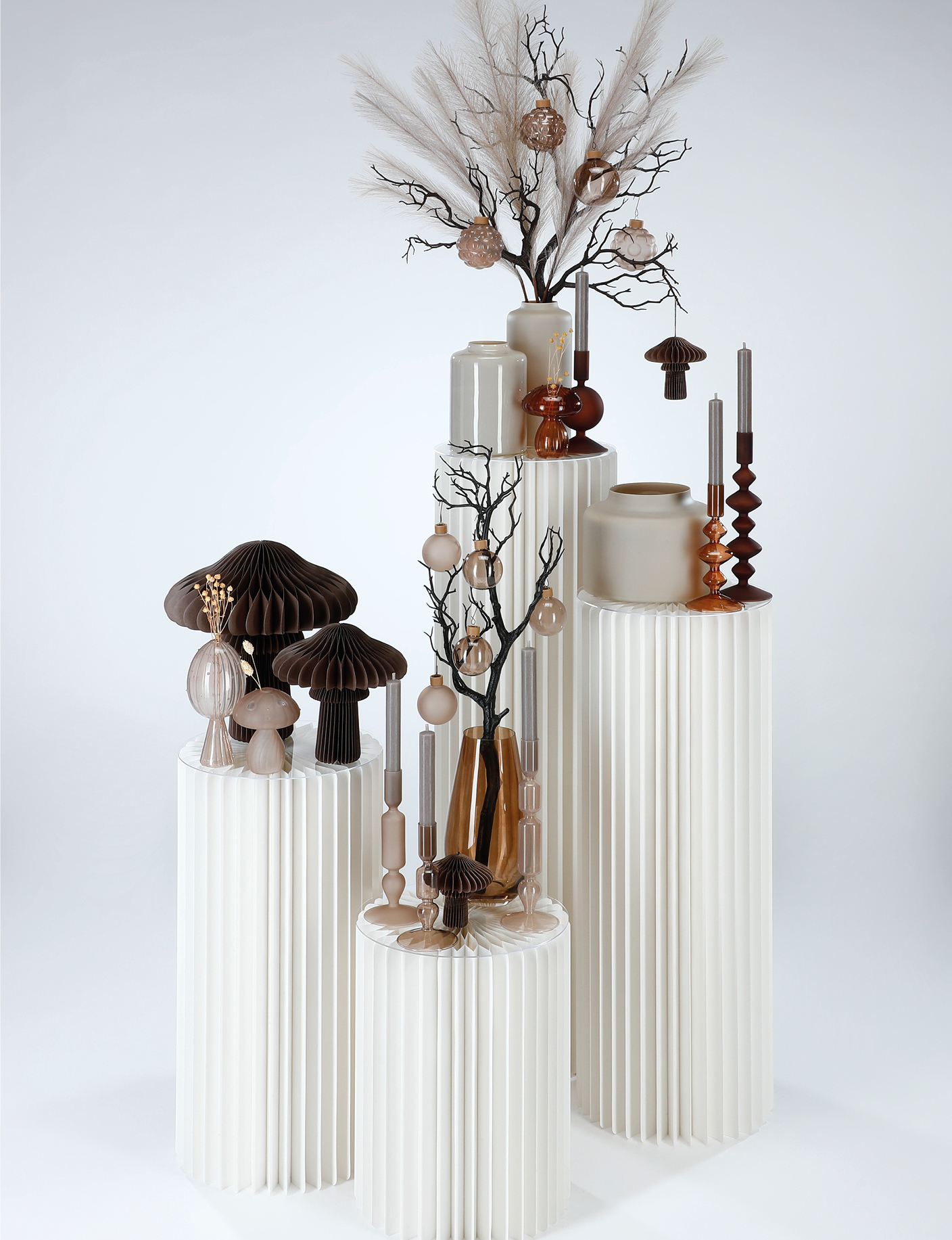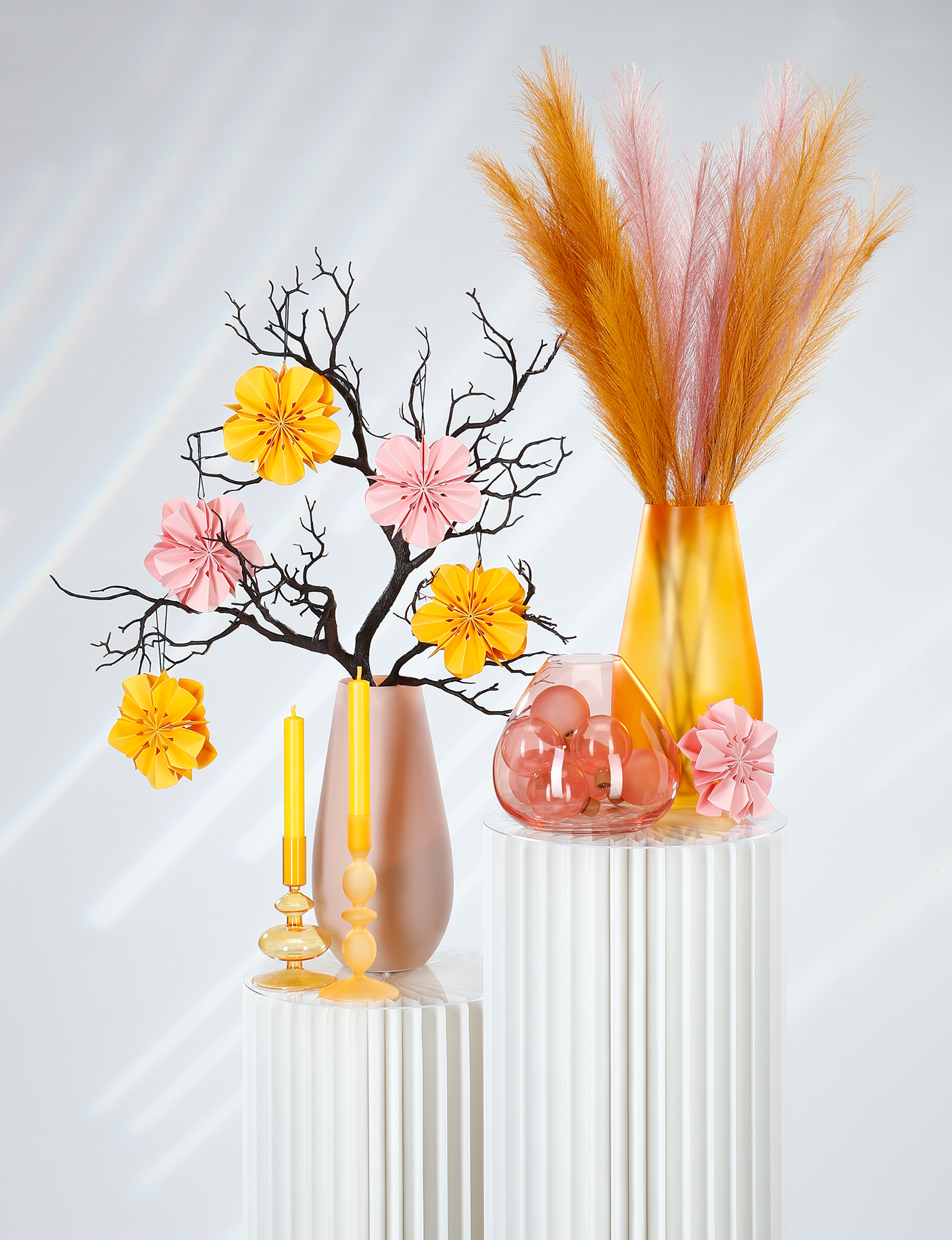Elegante Farbkompositionen für das ganze Jahr lassen Ihnen den Raum für ein individuelles Farbspiel. Aus zartem Glas mit exklusivem Eco-Aufhänger (gesetzlich geschützt), Pampasgras, Zweigen und feinen Vasen gestalten Ihre Kunden mit wenigen Handgriffen eine stilvolle Dekoration für ihr Zuhause.