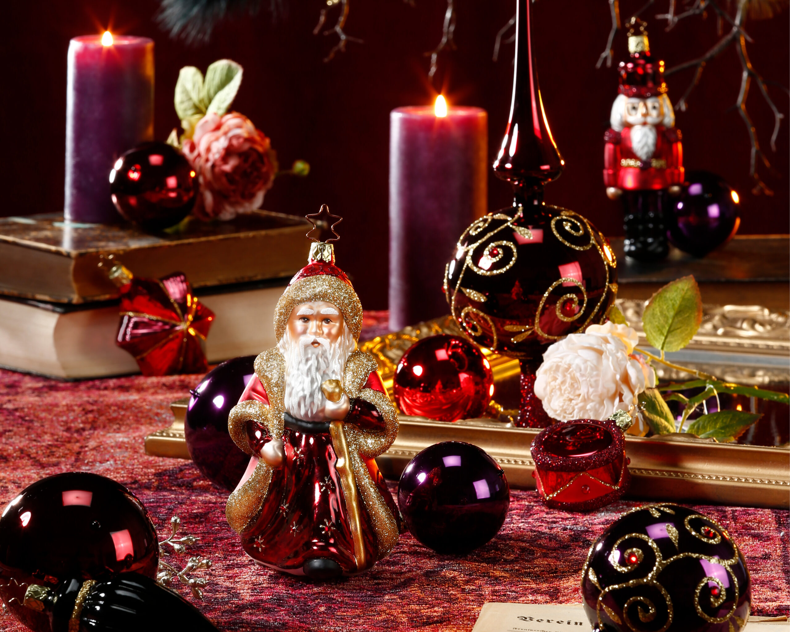 Im sanften Schein der Kerzen funkelt der Weihnachtsbaum in einer Atmosphäre eleganter Leidenschaft. Zwischen den glatten, tiefroten Kugeln leuchten mit Kristallen besetzte Glocken, deren Facetten das Licht in tausend funkelnde Sterne verwandeln. Ein prächtiger Pfau, in edlen Rottönen und Gold, breitet seine schillernden Federn aus, während ein Nussknacker mit majestätischem Blick in traditioneller Haltung die Szenerie bewacht. Der Weihnachtsmann, in seinem roten Gewand und funkelnden Details, schenkt dem Baum eine festliche Lebendigkeit. Jede Verzierung erzählt von Leidenschaft, Tradition und einem Hauch von Luxus. Ein Kunstwerk aus Wärme und Glanz, das den Raum in eine Welt voller festlicher Magie entführt.